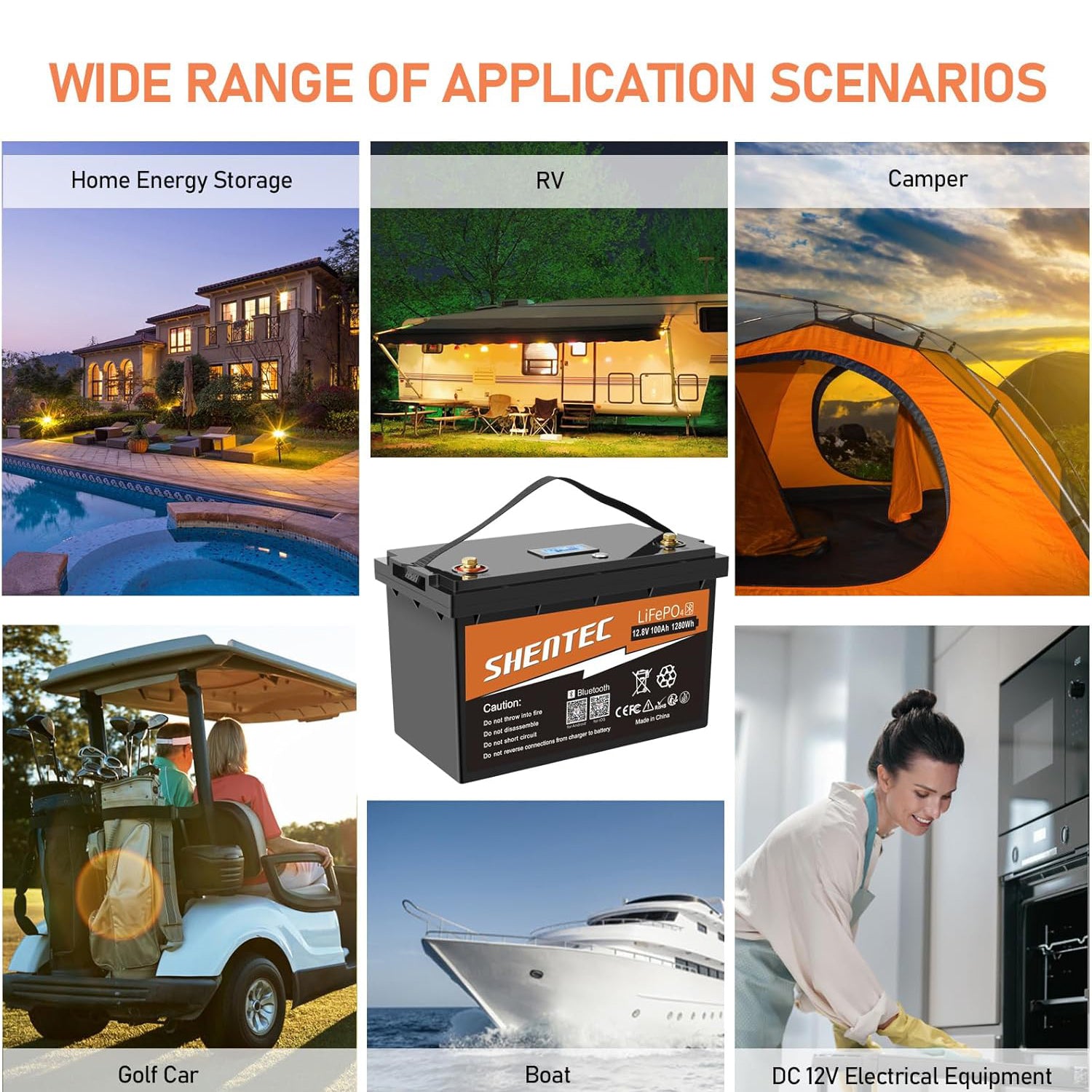 • Many applications: the 12 V 100 Ah LiFePO4 lithium-ion battery can be safely used in many areas: emergency power supply, home energy storage system, lighting, fish finder, lawn mower, golf cart, boat, solar system, 12 V router, backup UPS, portable TV, motorhome more.